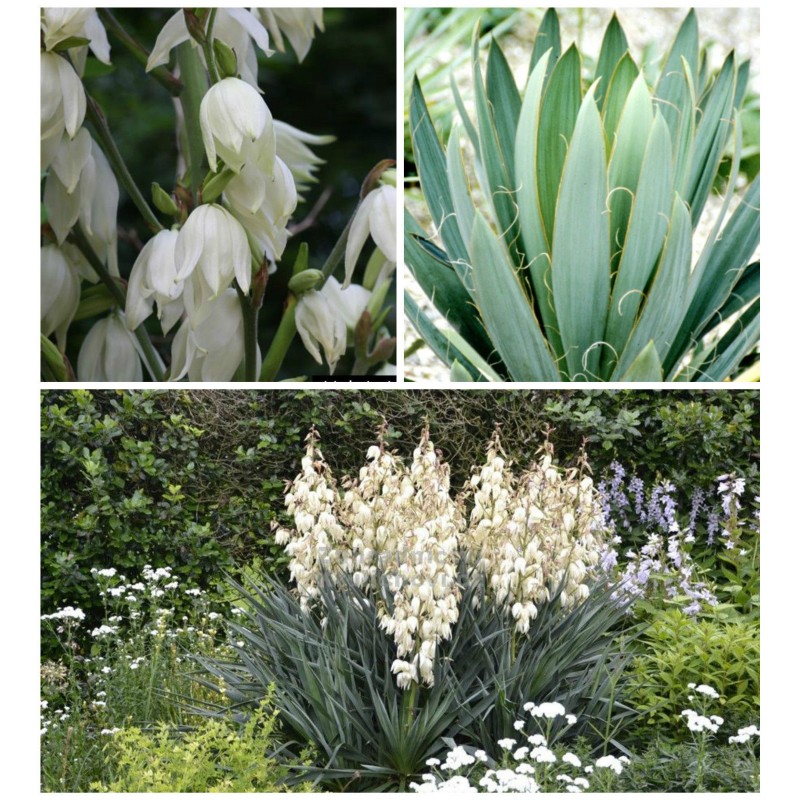 I fiori di color crema lunghi tra i 5-8 cm sono riuniti in pannocchie erette lunghe tra 50 cm e 150 cm fioriscono tra giugno e luglio. La Yucca è ermafrodita (ha sia fiori maschili che femminili).